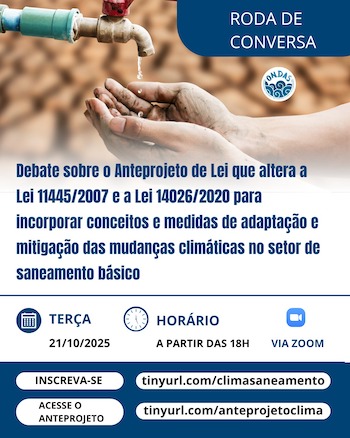 O ONDAS vai realizar, no dia 21 de outubro, às 18h, debate sobre o Anteprojeto de Lei que altera a Lei 11445/2007 e a Lei 14026/2020 para incorporar conceitos e medidas de adaptação e mitigação das mudanças climáticas no setor de saneamento básico. Inscreva-se para participar!