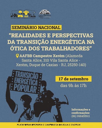A Plataforma Operária e Camponesa de Água e Energia (POCAE) realiza o Seminário Nacional “Realidades e Perspectivas da Transição Energética na Ótica dos Trabalhadores”no dia 17 de setembro de 2025, das 9h às 17h, na Associação de Aposentados e Funcionários do Banco do Brasil (AAFBB), em Xerém, Duque de Caxias/RJ.